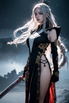 best qualitymasterpiece,illustration,extremely detailedCGunity8k wallpaper,Amazing,finely detail,masterpiece,best quality,official art,extremely detailed CG unity 8k wallpaper,(solo),((naval uniform)),((small breasts)),(red eyes),((black eye shadow)),((grey hair)),((long hair)),((long lock)),((crown)),((red gemstone)),(ruby),((dark fog)),((darkness)),(dark persona),(((torn long dress))),(((greatsword))),((floating hair)),((hubrael)),(black gloves),