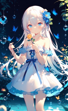 (masterpiece),(best quality),illustration,ultra detailed,hdr,Depth of field,(colorful),loli,Artist:ask (askzy),Artist:chen bin,Artist:onineko,1girl,flower,solo,hair ornament,dress,bug,butterfly,blue eyes,hair flower,long hair,holding,looking at viewer,blue flower,white dress,blue butterfly,bare shoulders,food,fruit,hair between eyes,strapless dress,strapless,jewelry,collarbone,white hair,blush,ribbon,standing,plant,closed mouth,bracelet,water drop,blue ribbon,leaf,