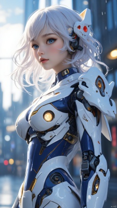 Color difference, soft light, (masterpiece), (best quality), (detail), (masterpiece), (high resolution), (perfect face), glowing eyes, ((Flower city)), (street), daytime, natural light, rain, reflection, blue eyes, Rococo, perspective, city street, ((1 girl)), blush, delicate facial portrayal, solo, 1 girl, 1/3 suit, cute, ultra high resolution, woman, (blue clothes ), (collar), (Bright skin :1), (Bright skin :1.1), (Delicate beautiful eyes :1.2)8K resolution, best picture quality (masterpiece), best quality, cute girl, (bishoujo ), (Masterpiece, best quality, official art, extremely detailed CG8k wallpaper), game_CG, white hair, flowing hanfu, slim leather jacket, (((embroidered leather tights))), (((mecha girl)) ), mechanical high heels, mechanical exoskeleton armor, silver body, blue eyes, neck protector, tactical leg knee pads, single exoskeleton armor, mechanical headgear, white mechanical clothes, chest mechanical armor 8K resolution, best Picture quality (masterpiece), best quality, cute girls, (bishoujo), (masterpiece, best quality, official art, extremely detailed CG8k wallpapers), xihua