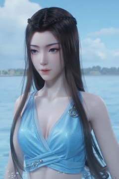 1girl, babydoll, breasts, brown hair, cleavage, collarbone, cowboy shot, earrings, hair ornament, jewelry, lingerie, lips, long hair, looking at viewer, makeup, navel, navel piercing, necklace, panties, parted lips, ribbon, see-through, solo, standing, underwear, very long hair,beach, blue sky, boat, caustics, cloud, cloudy sky, pool, poolside, river, sand, scenery, seagull, shore, sky, soaking feet, standing on liquid, wading, walking on liquid, water, watercraft, waves,(Pure blue sea:1.6),Xyuanyao