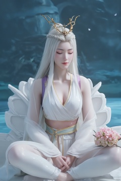 Chinese mature woman, sitting cross-legged on a white lotus throne, wearing a golden hat on her head, anime style appearance, white neon bra, white Hanfu, golden crown, eyes closed, girl, jewelry, long hair, white hair, cute, Hanfu, Dunhuang, hold out the hydrangeas with both hands, hold them tightly, look at the hug, look at the body, the cute little princess, Mrs. Dragon, wearing a pair of dragon horns on her head ((Masterpiece, best quality)),(( Well structured, well composed, luminous), translucent woman), tiny gold accents, beautiful and intricate details, ethereal light, whimsical imagining, art by Michif blue theme, off original, view ( beautiful),transparent,shiny_clothes,pink chest pleated skirt,white with yellow pimples,pink pimples,((water drops)),wet clothes,((beautiful details water)),(( Floating)), dynamic angle, ((beautiful details of the butterfly)), ((beautiful details of the stars)), ((slip dress)), particles, (beautiful details of the starry sky), (hazy fog), (beautiful Fragments) details), (((standing on the sea))), yellow belt, purple belt with white belt, light green belt,(big breasts:1.89),,(Pure blue sea:1.6),Xyuanyao