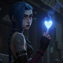 A Jinx with a fierce, yet melancholic expression stands in a dark, moody environment. She has striking electric-blue hair styled in long, messy braids. Her intense gaze is directed slightly upward, with large, expressive eyes that carry a blend of sadness, determination, and introspection. Her face is adorned with subtle freckles, and her complexion is pale. She wears a form-fitting, sleeveless black outfit with intricate leather details, giving a sense of a rebellious and battle-hardened character. Her right arm is tattooed with swirling, cloud-like patterns, and her left hand is covered by a fingerless glove that extends past her wrist. She holds her fingers in a gun-like gesture, and from the tips of her fingers, a magical, glowing blue flame or energy is emerging, illuminating her face with a soft, ethereal glow. The energy appears to take on a heart-like shape as it rises, adding a touch of vulnerability to her otherwise tough demeanor. The lighting is dark and atmospheric, with deep shadows that contrast the soft, blue light emanating from her magic. The background is blurred and mysterious, consisting of dark, undefined structures that suggest a gritty, urban environment, possibly in a dystopian or post-apocalyptic world. The overall color palette of the scene is dominated by cool blues, purples, and blacks, adding to the sense of mystery and intensity. The mood of the scene is a mix of somber reflection and quiet power, as if she is on the verge of a significant decision or conflict, <lora:jinx-arcane-league-of-legends-season-1:1>