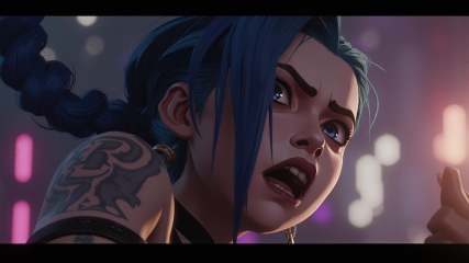 Create a highly detailed, cinematic portrayal of Jinx inspired by the Arcane animation style. Capture her in a dynamic action pose with expressive facial emotions, vivid colors, and dramatic lighting. Her signature blue hair should be flowing wildly, with intricate details on her tattoos and outfit. The scene should evoke a tense atmosphere. Emphasize a sense of movement and energy, with attention to textures, shadows, and depth to give the image a truly immersive, Arcane-like feel, <lora:jinx-arcane-league-of-legends-season-1:1>