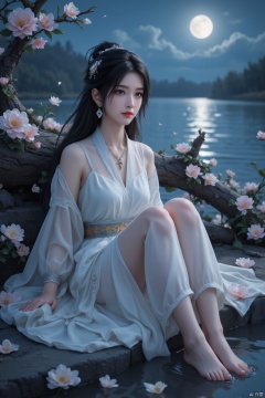 SFW,(masterpiece:1.2),best quality,absurdres,masterpiece,original,extremely detailed wallpaper,perfect lighting,(extremely detailed CG:1.2),1girl, solo, long hair, black hair, hair ornament, dress, jewelry, flower, earrings, lying, sky, water, necklace, white dress, petals, bare legs, night, moon, night sky, branch