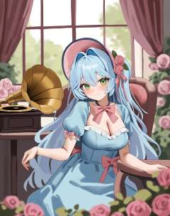 high quality,yt fungi,1girl,flower,solo,long hair,window,pink flower,dress,green eyes,blue hair,bonnet,smile,sitting,indoors,blurry foreground,short sleeves,puffy sleeves,chair,pink rose,hair intakes,phonograph,table,curtains,bow,closed mouth,blurry,puffy short sleeves,very long hair,hat,blue dress,hat flower,ribbon,blush,hair between eyes,depth of field,pink bow,cleavage,rose,