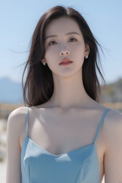 tianhai girl,photograph,A beautiful 18-year-old Chinese girl cloth a blue one piece On the beach again ,Looking at you with affectionate eyes,exuding the atmosphere of youth and loneliness,film stock,realism,realistic emotions,realistic light and dark relationships,realistic light and shadows,extreme details,realistic skin conditions,8K ultra-high definition,award-winning photography,masterpiece,best quality,
