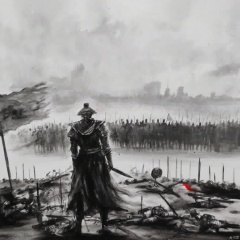 Cinematic still a warrior in traditional kimono with a red sword standing on a rocky terrain surrounded by other weapons with a figure in the background and a flag with a waving flag all in black and white intense and dramatic intense gaze and intense mood with red accents overcast sky., ink painting, A painting of a man holding a flag standing on a body hill with many people in the background, holding, standing, monochrome, weapon, male focus, multiple boys, sword, cape, holding weapon, armor, holding sword, helmet, letterboxed, polearm, spot color, spear, flag, full armor, hat, blood