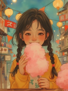 OBxiantiao,The little girl with braided hair is eating cotton candy, with a happy smile on her face.
