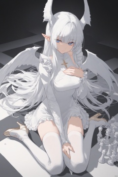 1girl, solo, long hair, looking at viewer, bangs, blue eyes, thighhighs, long sleeves, dress, sitting, closed mouth, flower, white hair, boots, frills, indoors, blunt bangs, white dress, high heels, white thighhighs, wariza, white footwear, high heel boots, checkered floor, chess piece,dargon hord,dargon wings,dargon tail,(one hand on chest)
