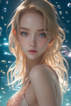 masterpiece, best quality, ultra-detailed, detailed pupils,a close-up of a fair-haired blonde girl with blue eyes and a pink lip is depicted. Her blonde hair cascades over her shoulders, framing her face. Her eyes are a piercing blue, and her eyebrows are a lighter shade of brown. Her hair is cascading down her right shoulder, adding a touch of warmth to her appearance. She is wearing a light-colored bra, adorned with a sheer design, accenting her body. The backdrop is a deep blue, with bubbles floating in the air, adding depth to the scene, real photos, cinematic, high quality, studio lighting,HD, 32k, best quality, 8k, super clean,xihua