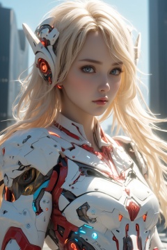masterpiece, best quality, ultra-detailed, detailed pupils,a close-up of a girl with long blonde hair and blue eyes stands in front of a blurred backdrop of skyscrapers. The girl's eyes are a piercing blue, and her lips are painted a pinkish-red color. Her hair cascades over her shoulders, framing her face, adding a pop of color to the scene. She is dressed in a white and red robot-like outfit, adorned with red and blue lights. The robot's arms are positioned in a way that creates a striking contrast, real photos, cinematic, high quality, studio lighting,HD, 32k, best quality, 8k, super clean,xihua