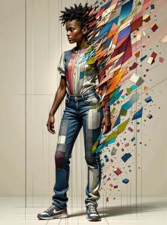 DonMFr4ctur3dD1ffFXthe, geometric shapes, sfw, female youth, slinky, afro-caribbean, brown eyes, small ears, v-shaped chin, oval face shape, , peach half-up, half-down hairstyle hair, interest wearing muslin skinny trousers, damask suede collarless blouse, , standing with hands in front, suggesting submission, slim upper body clothing, synaptic webbing, puff sleeves, high-low hemline, high waist, sequin embellishments, front pockets, dark wash, reinforced knees, pockets,, snug lower body clothing, microalgae weave, watercolor paint, oversized fit, empire waist, raw wash, knee pads,
