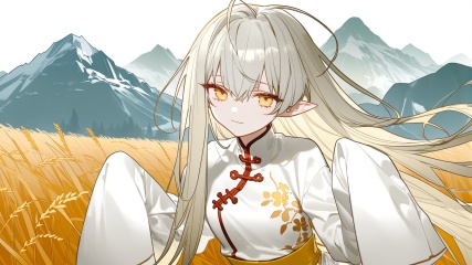 bm tol,ask \(askzy\),(mountain han:2),kidmo,applepie \(12711019\),minimalism,close-up,looking at viewer,1girl,solo,eyeshadow,crossed bangs,ahoge,very long hair,yellow eyes,curly hair,(white hair:1.5),pensive,sad smile,pointy ears,White dense eyelashes,Exquisite clothing,white Chinese clothes,(white hanfu:1.1),yellow belt,sleeves past fingers,yellow Marginal decoration,white long boots,wheat field,mountain,