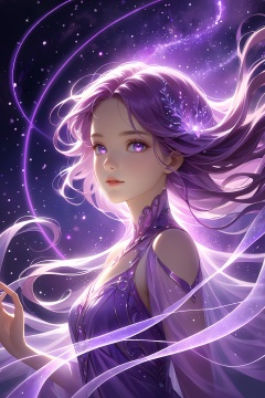 particle style,upper body portrait,She stands in a haze of purple ethereal lights,her silhouette outlined in a mysterious glow,a goddess descending from the heavens. The purple ethereal lights dance around her,creating a dreamlike aura that enhances her ethereal beauty. Her eyes sparkle with purple ethereal lights,as if containing the secrets of the universe,drawing one into a world of wonder. Her hair flows gracefully in the purple ethereal lights,adding a touch of enchantment to her already captivating appearance. With every movement,the purple ethereal lights seem to intensify,highlighting her elegance and grace.glowing,