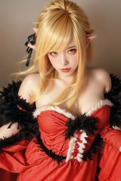 1girl solo long hair breasts smile blonde hair gloves dress ribbon bare shoulders hair ribbon yellow eyes pointy ears elbow gloves red dress oshino shinobu kiss-shot acerola-orion heart-under-blade