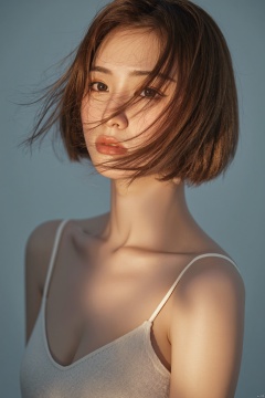 1girl, solo, breasts, looking at viewer, short hair, brown hair, black hair, brown eyes, collarbone, upper body, lips, sunlight, realistic