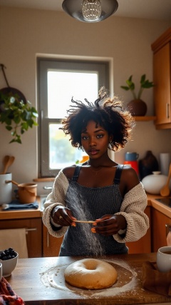 An engaging eye-level shot of a beautiful black-skinned woman with natural hair, baking in a cozy kitchen filled with warm colors and delicious aromas, flour dust dancing in the sunlight pouring through the window <lora:Ebony_Beauties:1>