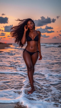 A stunning panoramic shot of a beautiful black-skinned woman with flowing hair, gracefully walking along a beach at sunset, waves gently crashing at her feet, the vibrant sky casting a warm glow over the scene <lora:Ebony_Beauties:1>