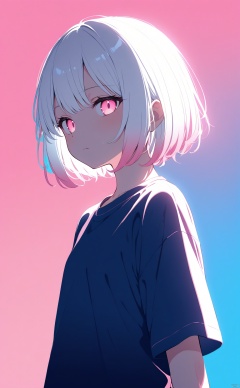 masterpiece,best quality,high quality,(colorful),loli,blue background,backlighting,pink background,multicolored hair,gradient background,simple background,expressionless,shirt,glowing,1girl,white hair,short hair,