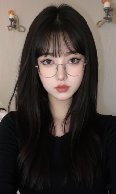 This is a real high-definition photo,Young woman, oval face, almond-shaped eyes, neutral expression, long dark hair, light makeup, wearing a black top and glasses, contemporary style, indoor background with wall decorations, full-body shot, soft natural lighting, clear skin texture. <lora:网图-MYH-2:0.9>