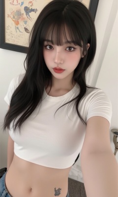 This is a real high-definition photo,<lora:网图-MYH-2:0.9>,This is a clear mobile selfie photo with a modern and fashionable style. The person in the photo is a young woman with long black hair, a slim figure, and delicate features. She looks at the camera with a calm expression. She is wearing a white short-sleeved top, exposing her abdomen, which has a tattoo. She wears jeans, and her hair falls on her shoulders. The background features a framed painting, which seems to depict some abstract elements.