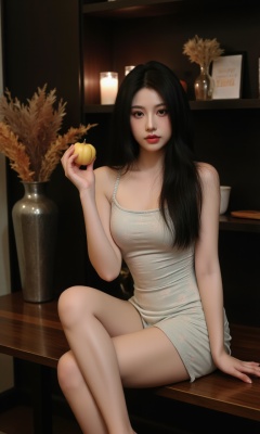 The image is a high-resolution photograph featuring an East Asian woman with long, straight black hair and fair skin. She is seated on a wooden table, her body angled towards the camera, with one leg bent and the other extended. She wears a strapless, form-fitting dress in a soft pastel color with a subtle floral pattern. The dress accentuates her slender physique and small breasts. Her expression is calm and slightly pensive, with her eyes gazing directly at the camera.In her right hand, she holds a small, round, yellow gourd. The background is dimly lit, with a dark wooden shelf filled with various items, including a candle and a vase with dried flowers, adding a rustic, cozy atmosphere to the scene. To the left, there is a large, metal vase containing autumnal foliage in shades of orange and brown, contributing to the seasonal feel of the setting. The table she sits on has a smooth, polished finish, and the texture of the wood is evident. The overall mood of the photograph is serene and intimate, with a focus on natural beauty and simple elegance.<lora:网图-MYH-2:1>