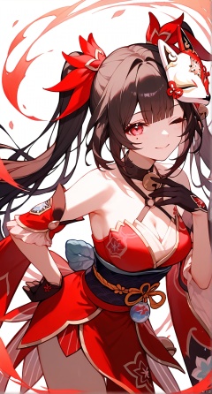 1girl, solo, long hair, breasts, looking at viewer, smile, bangs, black hair, red eyes, gloves, dress, cleavage, bare shoulders, twintails, medium breasts, one eye closed, japanese clothes, kimono, hand on hip, bell, leaning forward, mask, red dress, mask on head, fox mask,sparkleSR