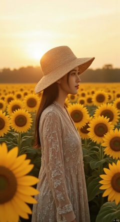 ((Girl in straw hat looking back in a field of sunflowers)), (backlight), (best illumination, best shadow, an extremely delicate and beautiful), Girl on the center axis of the picture, small breasts, ((Sunflowers with the ultimate in detail)), beautiful detailed sky, Perfect body, (beautiful detailed face), extremely delicate and beautiful girls, Sunflower fields at sunset, sunset, black hair, beautiful detailed cloud, (((extremely detailed CG unity 8k wallpaper, masterpiece, best quality, ultra-detailed))), dynamic angle, floating, finely detail, (bloom), (shine), glinting stars, feather,nature,(sunlight), fairyland, (((The character is in the center of the frame))) ,meinvzi