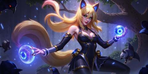 hezi,lol style,Splash art,Cool,game art,Game art,LOL propaganda poster texture,1girl,long hair,animal ears,breasts,magic,bangs,bare shoulders,dress,outdoors,blonde hair,fox ears,ahri \(league of legends\),tail,fox tail,hair over one eye,solo focus,bird,medium breasts,armor,cleavage,tree,smile,glowing,black dress,multiple others,gem,detached sleeves,night,looking at viewer,red lips,long sleeves,orb,nature,forest,weapon,alternate costume,closed mouth,helmet,pants,cowboy shot,pink eyes,solo,multiple tails,blue eyes,official alternate costume,green eyes,standing,facial mark,green hair,dark,fox girl,large breasts,crow,sword,lipstick,makeup,animal,helm,1other,purple lips,2others,one eye covered,energy ball,black pants,glowing eyes,lips,whisker markings,breastplate,