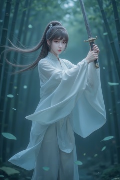 A girl in a white Hanfu is flying with a sword against a forest background in the style of Chinese martial arts. The full body photo has an anime art illustration style with a dark green and light blue color palette creating an ethereal atmosphere. The charming character is depicted in a surreal photography style using a fisheye lens in a mysterious environment with soft lighting. She makes elegant movements with flowing long hair in a cool color tone,solo,weapon,nature,bamboo,forest,long hair,bamboo forest,ponytail,brown hair,(((Floating in the sky))),with a floating headband. Dark green background,blurred background,wearing white Hanfu,holding a long sword,(8k, RAW photo, best quality, masterpiece:1.2),