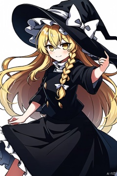 simple background,kirisame_marisa,witch_hat,kirisame_marisa,hat,blonde_hair,solo,braid,yellow_eyes,long_hair,witch_hat,single_braid,white_bow,hair_bow,black_skirt,white background