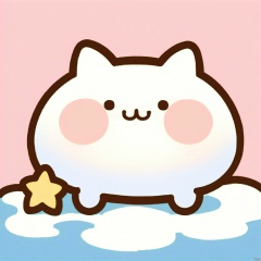 bestquality, 1 white cartoon cat, no human, solo, smile, round face, small black eyes, petite chubby body, cartoon, star, sitting in the cloud, light pink background.