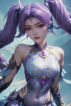 score_9, score_8_up, score_7_up,highly detailed digital,1girl, solo, long hair, looking at viewer, twintails, jewelry, purple eyes, purple hair,,She has pale, almost translucent skin,1girl,aichen