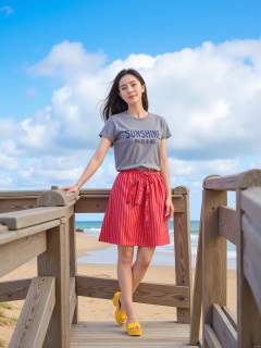 A young Asian woman stands confidently on a weathered wooden boardwalk, right arm extended, left hand grasping railing as she gazes off-frame. Framed by the rustic dock's worn planks, she wears a vibrant red-striped gray skirt and bright yellow sandals. The ocean's gentle waves lap at the sandy shore behind her, where a brilliant blue sky dotted with puffy white clouds meets the horizon. A subtle smile plays on her lips, and bold letters SUNSHINE emblazoned across her chest shine in warm sunlight.