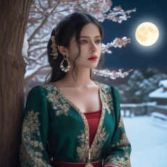 (,1girl, ,best quality, ),,  picture-perfect face,   clean, masterpiece,     cinematic lighting, cinematic bloom, fantasy,  , unreal, science fiction, ((,1girl, pov,))(((,tree, 1girl, full moon,snowing,snow ,solo,     solo focus,  long_hair, looking_at_viewer,  )))  (rich:1.4,)     prestige, luxury, jewelry, diamond, gold, pearl, gem, sapphire, ruby, emerald, intricate detail, delicate pattern, charming, alluring, seductive, erotic, enchanting, hair ornament, necklace, earrings, bracelet, ,(sit), <lora:823-DA-XL-国模-恶女-VIVI:0.8>,