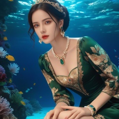 (,1girl, ,best quality, ),,masterpiece, ((((, solo,  , ,solo focus, ,underwater, )))) ,ultra realistic 8k cg,   clean, masterpiece,     cinematic lighting, cinematic bloom,  (( , )),, , unreal, science fiction, luxury, jewelry, diamond, gold, pearl, gem, sapphire, ruby, emerald, intricate detail, delicate pattern, charming, alluring, seductive, erotic,(sit), , enchanting, hair ornament, necklace, earrings, bracelet, armlet,,(cleavage),, <lora:823-DA-XL-国模-恶女-VIVI:0.8>,