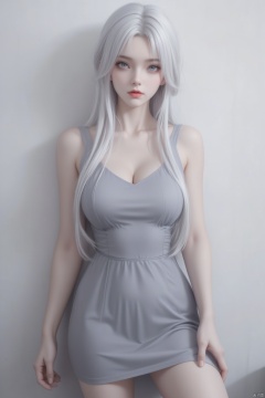 1girl, solo, long hair, breasts, looking at viewer, dress, medium breasts, closed mouth, standing, white hair, lips, grey eyes, makeup, facial mark, red lips, against wall, grey dress