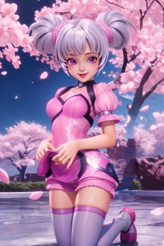 :),kneeling,puffy short sleeves,looking at viewer,pink skirt,Blue sky,Cherry Blossoms,petals, looking at viewer, 1girl,solo,chibi,loli,short hair,makeup,breasts,thighhighs,twintails,hair bun,(8k, RAW photo, best quality, masterpiece:1.2),(realistic, photorealistic:1.3),ultra-detailed,extremely detailed cg 8k wallpaper,(chibi:1.3), Thin legs,Gradient Thigh Socks,
