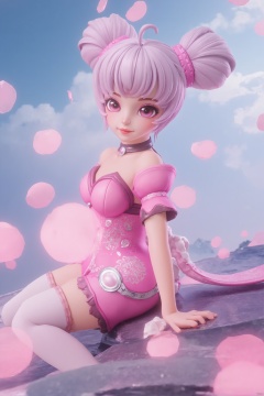 topknot,sitting, looking at viewer, waterfall, (cherry blossoms), (milfeulle sakuraba),petals, sky, cloud, day, blue sky, petals, water, stone, loudy sky, 1girl,solo,short hair,makeup,thighhighs,twintails,hair bun,Pink and white thigh socks,nail polish, makeup,(8k, RAW photo, best quality, masterpiece:1.2),(realistic, photorealistic:1.3),ultra-detailed,extremely detailed cg 8k wallpaper,(crystalstexture skin:1.2),extremely delicate and beautiful