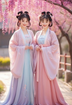 hanfu, jinghonghanfu, multiple girls, 2girls, black hair, flower, hair ornament, chinese clothes, dress, double bun, hair flower, realistic, hair bun, outdoors, standing, full body, red hair, own hands together, smile, blurry, wide sleeves, wisteria, cherry blossoms, looking at viewer, red lips, blurry background, masterpiece,best quality,high-resolution image,High quality,Superb lighting,Highly detailed,Sharp focus,8K UHD,
