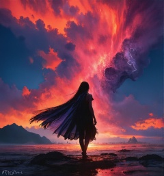 (masterpiece), cartoon, best quality,(photo_(medium):1.0), by Antonio J. Manzanedo, by Jeremy Lipking, lightning, in a surreal landscape, painting style with watercolor, Brushstrokes, black eyes,colorful,vibrant colors,1girl