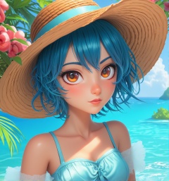 anime girl with blue hair wearing a straw hat and a blue dress, artwork in the style of guweiz, beautiful anime portrait, guweiz, beautiful anime girl, beautiful anime style, anime girl with teal hair, anime style. 8k, in the art style of bowater, beautiful digital illustration, beautiful character painting, stunning anime face portrait