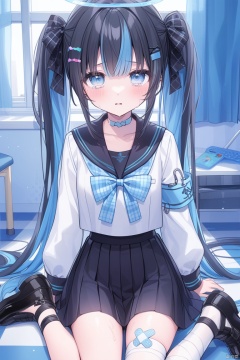 1girl, solo, long hair, looking at viewer, bangs, blue eyes, skirt, shirt, black hair, hair ornament, thighhighs, long sleeves, bow, twintails, sitting, very long hair, school uniform, blue hair, collarbone, hair bow, multicolored hair, pleated skirt, parted lips, shoes, serafuku, choker, puffy sleeves, indoors, tears, black skirt, sailor collar, black footwear, two-tone hair, white thighhighs, plaid, black shirt, window, black bow, halo, blue bow, wariza, bandages, phone, curtains, single thighhigh, armband, bandaid, puffy long sleeves, black sailor collar, black serafuku, bandaged leg, checkered floor, plaid bow, crossed bandaids, safety pin