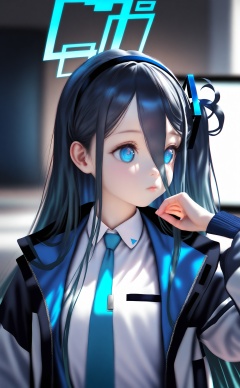 masterpiece,best quality,realistic,loli,1girl,aris (blue archive),blue eyes,solo,long hair,necktie,jacket,hair between eyes,shirt,blue necktie,black hair,white shirt,collared shirt,halo,upper body,long sleeves,open clothes,blurry,very long hair,long bangs,open jacket,one side up,blue hair,dark blue hair,blurry background,ringed eyes,hairband,indoors,school uniform,hand up,closed mouth,monitor,