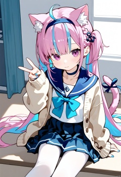 Elite,1girl, solo, long hair, looking at viewer, blush, bangs, skirt, shirt, hair ornament, long sleeves, bow, ribbon, animal ears, twintails, sitting, very long hair, closed mouth, school uniform, blue hair, purple eyes, collarbone, jacket, tail, white shirt, pink hair, braid, ahoge, pantyhose, multicolored hair, pleated skirt, hairband, frills, open clothes, serafuku, choker, indoors, virtual youtuber, cat ears, hand up, sailor collar, nail polish, two-tone hair, blue skirt, streaked hair, cat tail, animal ear fluff, sleeves past wrists, v, blue bow, cardigan, blue ribbon, cat girl, blue sailor collar, blue nails, white pantyhose, colored inner hair, anchor symbol, tail ornament, tail raised, blue hairband, anchor hair ornament, blue choker, tail ribbon, minato aqua