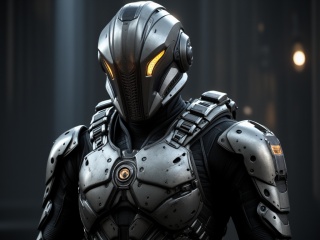 FuturisticWarrior style,, The image is a close-up of a futuristic-looking minmatar logistic dropsuit of armor. The minmatar logistic suit is made up of multiple layers of metal, with intricate designs and patterns. The armor appears to be made of a dark, textured material, with a metallic sheen that reflects the light. In the center of the minmatar logistic dropsuit, there is a large, circular emblem with a yellow light emanating from it. The emblem is surrounded by a grid-like pattern. On either side of the emblem, there are two smaller, rectangular structures that appear to be connected by a thin metal chain. The structures are connected to each other by a series of small, rectangular links, which are likely part of the armor's design. On the right side of each structure, there appears to have a larger, rectangular structure that is connected to the larger structure by a small, circular link. On both sides of the central structure, the smaller structures have multiple arms that extend from the bottom to the top, with multiple arms extending from the top to the bottom. The arms are also connected by two smaller arms, with one arm extending towards the left and the other extending to the right. The background of the image is dark, with streaks of light shining down on the suit.