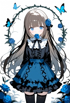 Elite,1girl, loli, solo, long hair, looking at viewer, blush, bangs, blue eyes, skirt, simple background, brown hair, shirt, black hair, hair ornament, thighhighs, long sleeves, white background, dress, bow, ribbon, very long hair, closed mouth, flower, cowboy shot, frills, black thighhighs, hair flower, blunt bangs, bowtie, zettai ryouiki, black shirt, black bow, rose, mouth hold, arms behind back, frilled dress, bug, plant, butterfly, blue flower, blue rose, vines, thorns