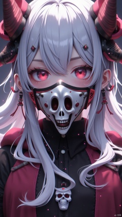 Masterpiece, best quality, amazing details, CG,1girl,Solo, horn, front, close-up, looking at the camera, ghost face mask, long hair, hair between eyes, tassels, bangs, red eyes, white hair, upper body, earrings, jacket, hairy, hair accessories, cross bangs, pink powder blusher, light particles, depth of field,