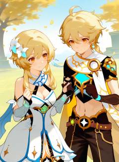 masterpiece,best qualty,lumine_\(genshin_impact\),flower,blonde_hair,1boy,aether_\(genshin_impact\),1girl,breasts,hair_ornament,dress,brother_and_sister,hair_flower,white_dress,siblings,yellow_eyes,white_flower,braid,long_hair,cleavage,gloves,bare_shoulders,scarf,white_scarf,short_hair_with_long_locks,detached_sleeves,hair_between_eyes,smile,navel,black_gloves,hands_up,closed_mouth,pants,shirt,lily_\(flower\),short_sleeves,midriff,blush,feathers,ahoge,outdoors,medium_breasts,sidelocks,feather_hair_ornament,tree,boots,petals,braided_ponytail,crop_top,large_breasts,black_shirt,
