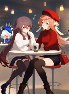 masterpiece,best quality,yanfei_\(genshin_impact\),multiple_girls,3girls,hu_tao_\(genshin_impact\),red_headwear,brown_hair,pink_hair,long_hair,closed_eyes,furina_\(genshin_impact\),cup,boots,bag,>_<,anger_vein,indoors,skirt,ahoge,alternate_costume,sitting,open_mouth,holding_cup,horns,smile,twintails,holding,handbag,cafe,table,long_sleeves,hat,blue_hair,green_eyes,disposable_cup,white_hair,blush,brown_footwear,tongue_out,antlers,tongue,thighhighs,multicolored_hair,stool,shirt,hair_between_eyes,black_skirt,sweater,contemporary,